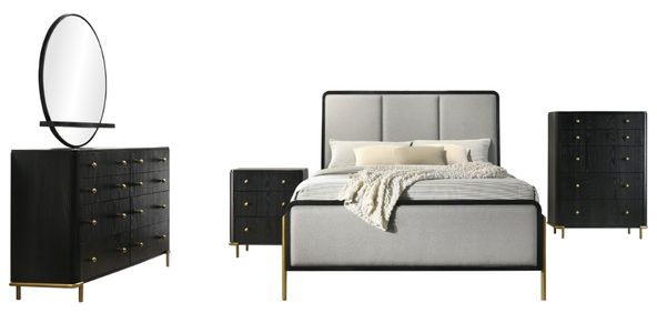 Infused with urban elegance, this five-piece modern bedroom set is everything you need for a fresh, sophisticated bedroom retreat. The bed boasts light grey upholstery over the head and footboards, with rounded corners and gold finish legs that soften the look.Read More