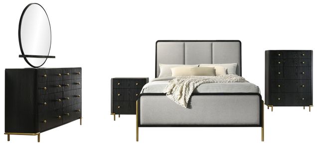 Infused with urban elegance, this five-piece modern bedroom set is everything you need for a fresh, sophisticated bedroom retreat. The bed boasts light gray upholstery over the head and footboards, with rounded corners and gold finish legs that soften the look.Read More