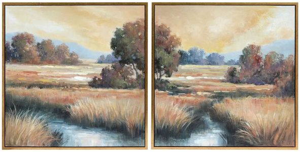 Introducing our Alston 2 set of two canvas paintings, a classic collection that beautifully captures the allure of a traditional landscape. These two canvases depict picturesque wetlands with distant trees, enveloped in a warm and inviting color palette of browns, greens, reds, and yellows.Read More
