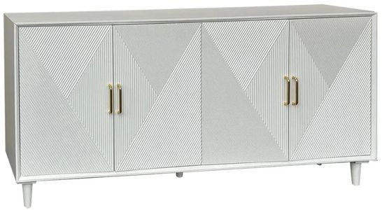 Elevate your space with this elegant media credenza/sideboard, crafted from acacia wood with pine veneer. Its bright white painted finish, enhanced with an oil coating, exudes timeless charm. Featuring four doors with striking diagonal detailing, upgraded European hinges, and sleek gold bar handles, it combines beauty and functionality.Read More