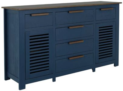 The Bonfire buffet is an exquisite piece that effortlessly combines functionality with style, making it an ideal addition to any dining room. Featuring a striking blue finish that beautifully contrasts with its brown top, crafted from durable pine wood and okume veneer, ensuring it stands the test of time.Read More