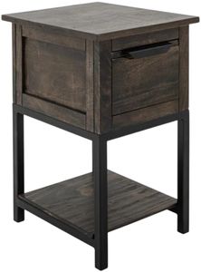 In addition to its attractive design, the Dark Mita collection offers practical features. The chairside table includes a sturdy metal base for support, a drawer with sleek black handles for storage, and a lower shelf ideal for displaying decorative items or organizing books and magazines. This combination of style and utility ensures the Mita collection is a beautiful and functional addition to any living space.